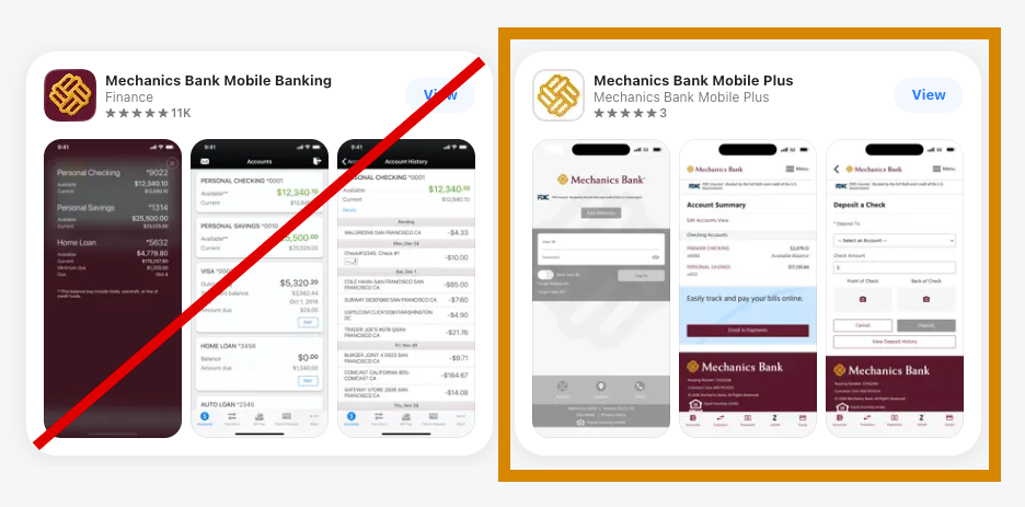 • The other Mechanics Bank mobile apps will NOT work with your account. Click on the appropriate app store link below to get to Mechanics Bank Mobile Plus.